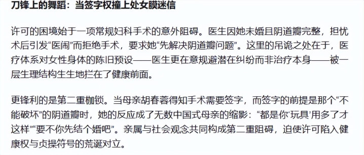 然后,退一步就按电影中所说,医疗系斡旋直在刁难女性,系统性的抱有辩论患者精真金不怕火与否的不雅念,和握有免责消灾的官僚倡导,使得咱们的女主东说念主公,在面对一个约略的小手术无法可想,那求教这是一个更为深广的权责不合等的医疗系统问题,照旧所谓“男权”的问题?